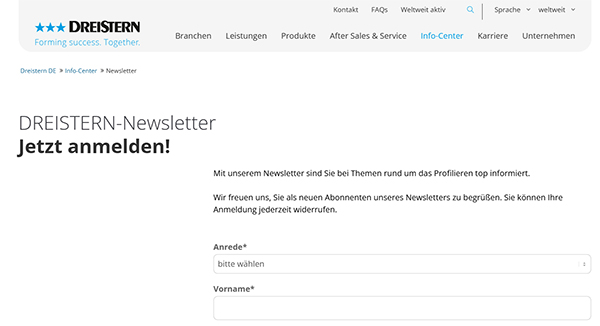Bleiben Sie immer auf dem neuesten Stand mit dem monatlichen Newsletter von Dreistern! Erhalten Sie regelmäßig spannende Einblicke zu Themen wie Innovation, Technologie, Nachrüsten, Modernisieren oder Ersetzen. Aber auch über unsere Service-Leistungen und Veranstaltungen. Wir versorgen Sie mit genau der richtigen Menge an Informationen – nicht zu viel, aber auch nicht zu wenig! Melden Sie sich jetzt HIER an und verpassen Sie keine wichtigen Updates mehr!